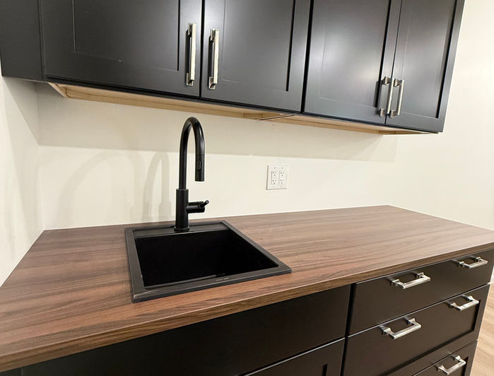 The studio also includes two luxury shampoo chairs with ergonomic lumbar and neck support, paired with premium shampoo sinks, and a spacious color bar with wet sink, cabinetry, and storage — ideal for maintaining organization and workflow.